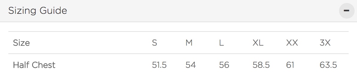 | Half Chest (cm) | 51.5 | 54 | 56 | 58.5 | 61 | 63.5 |